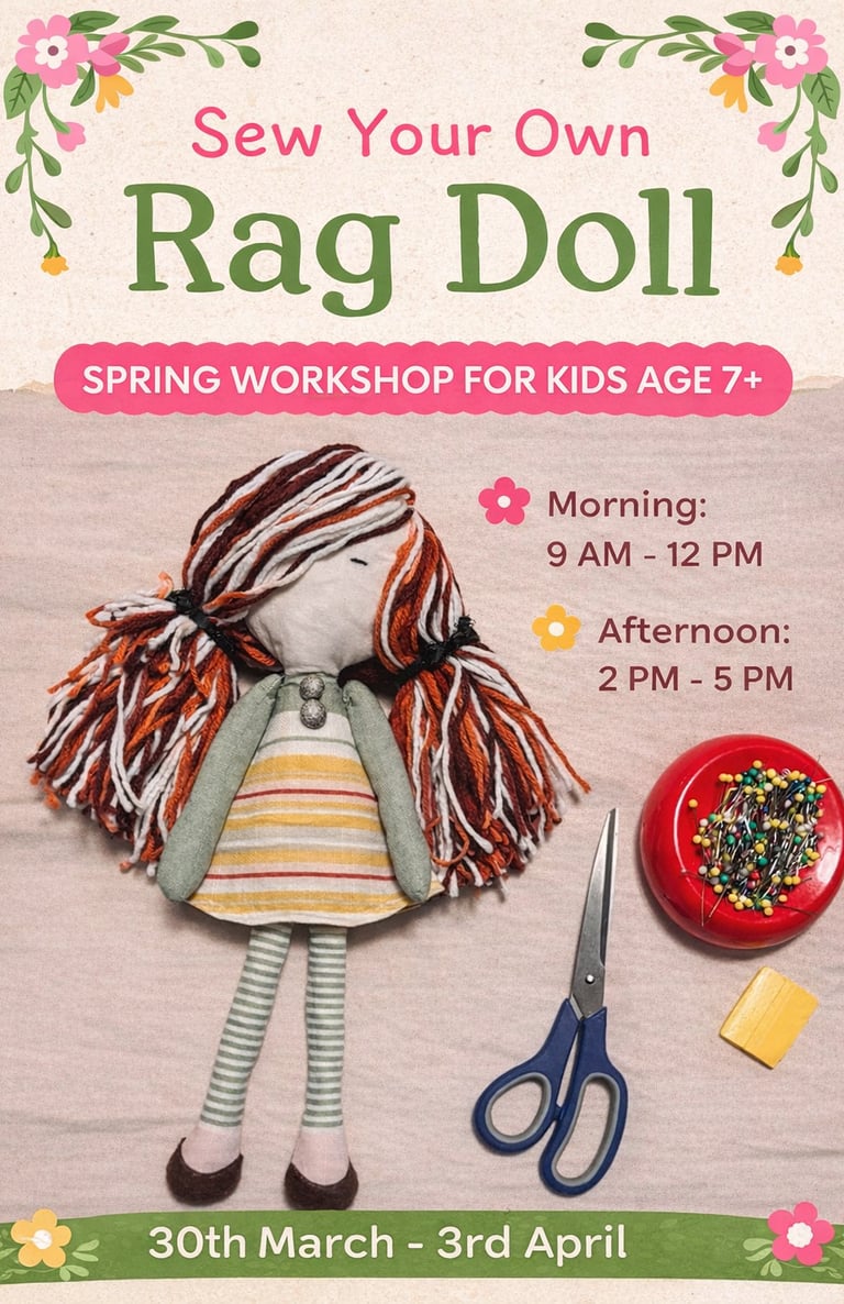 Join us for a 5- day creative sewing workshop where kids will design and sew their very own rag doll from start to finish!